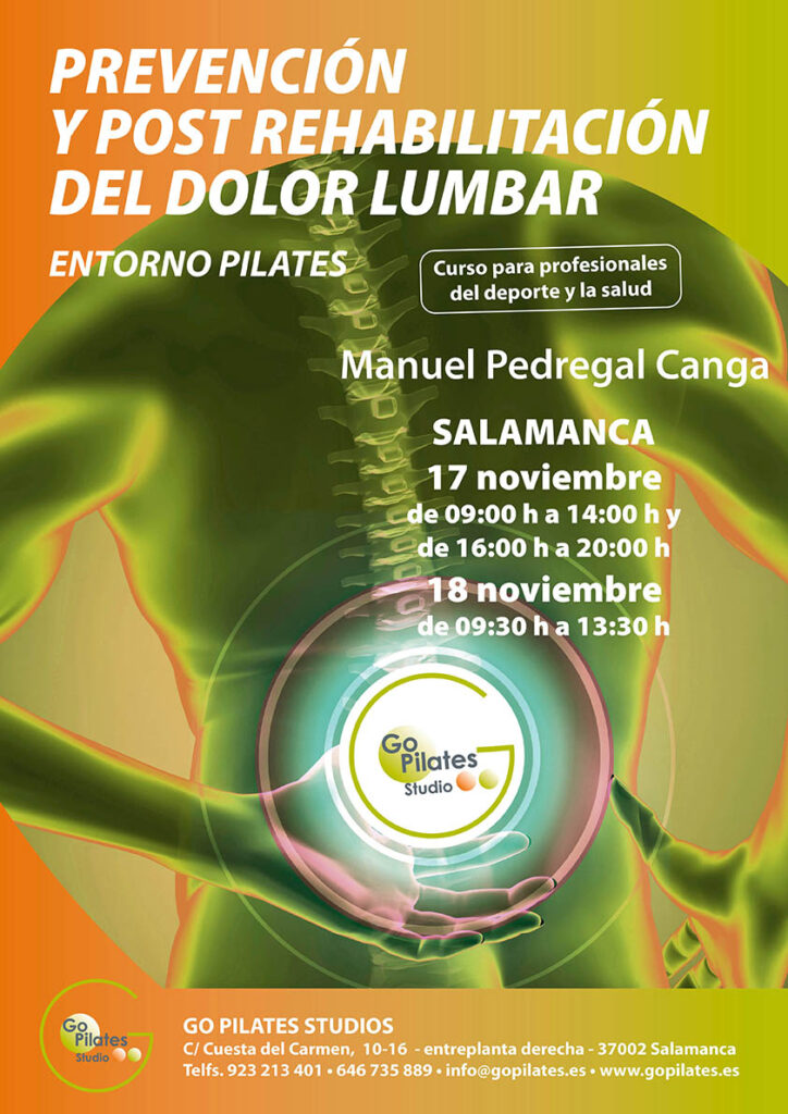CURSO Prevención y Post Rehabilitación del Dolor Lumbar. Entorno Pilates. Para profesionales del deporte y la salud. Manuel Pedregal Canga en Go Pilates Studio. Salamanca 17 y 18 de noviembre de 2018. MÁS INFORMACIÓN CV MANUEL PEDREGAL CANGA (PDF) DESCRIPCIÓN DEL CURSO (PDF)