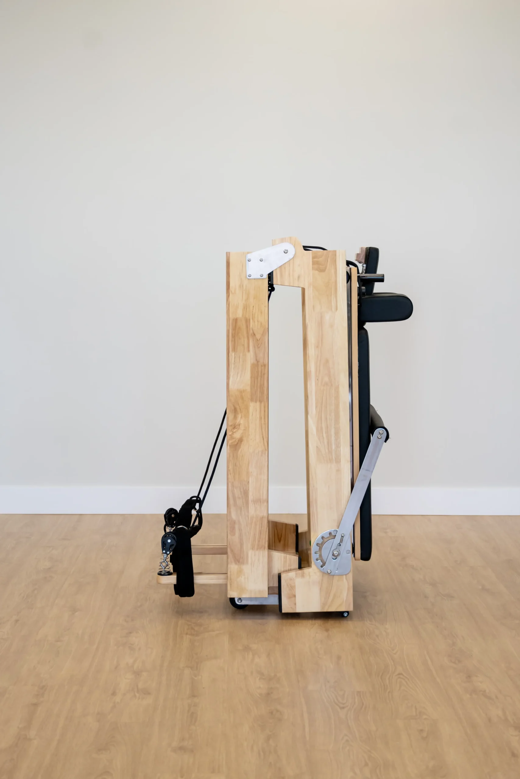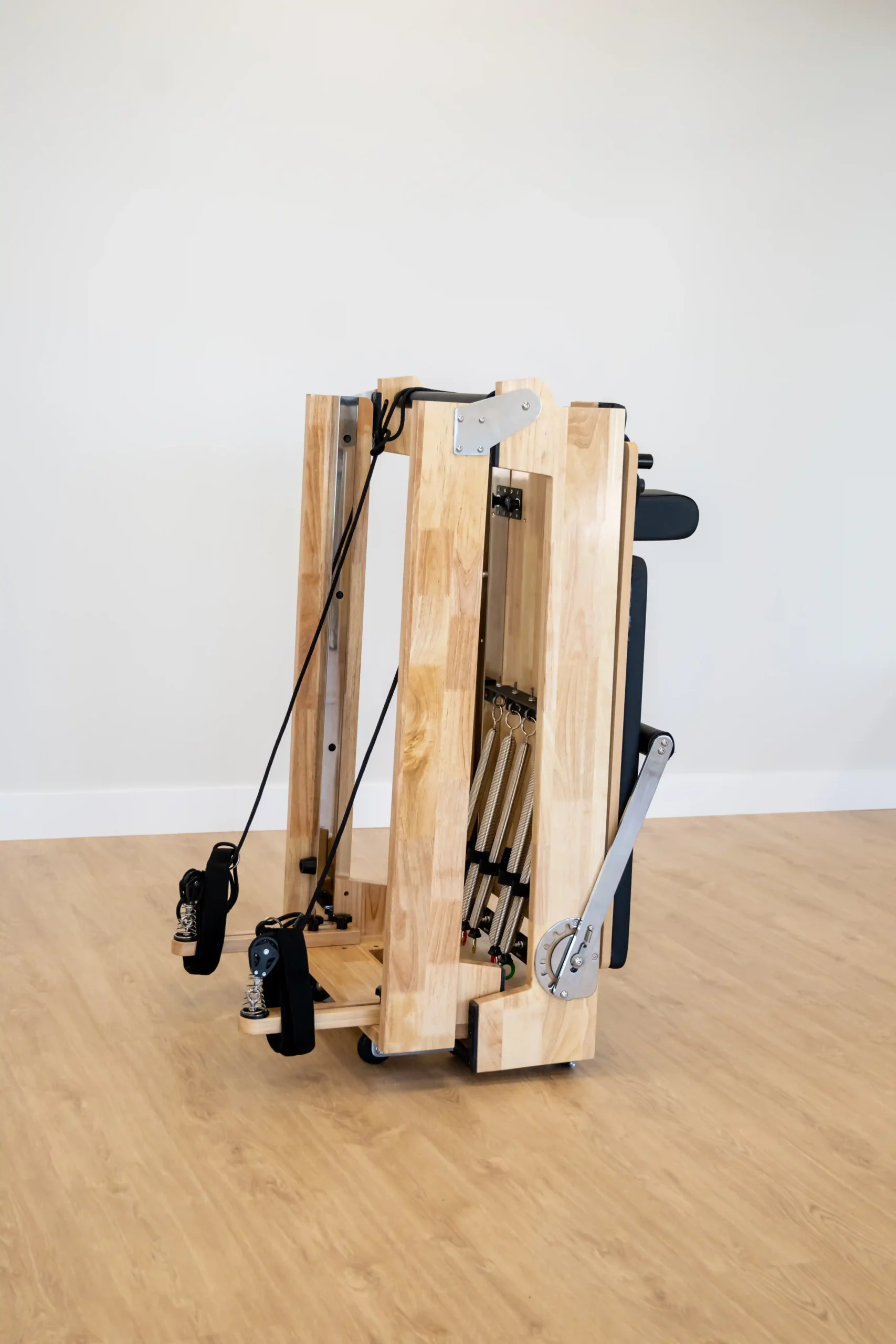 El Reformer Clásico by Go Pilates es una máquina de Pilates profesional plegable de madera, diseñada para quienes buscan la máxima calidad en el menor espacio.
